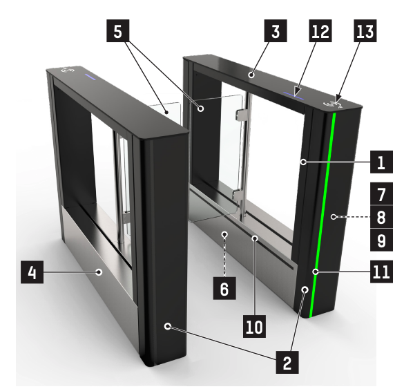10. Système de détection DIRAS propriétaire, constitué d’une matrice haute densité de cellules photoélectriques émettrices/réceptrices. Le système DIRAS suit la progression des usagers dans le couloir et assure leur sécurité lors de l’ouverture / fermeture des obstacles. Les nouveaux algorithmes de détection garantissent des performances haut de gamme pour la détection du petit train (même lorsque les personnes sont très proches l’une de l’autre) et d’autres types de fraude.